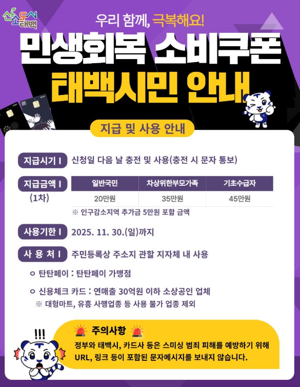 한편, 소비쿠폰 지급을 사칭한 스미싱 문자 피해가 우려됨에 따라 태백시는 "정부, 은행, 카드사 등은 민생회복 소비쿠폰과 관련해 URL이나 링크가 포함된 문자메시지를 발송하지 않는다"며, 출처가 불분명한 문자에 포함된 인터넷 주소(URL)를 클릭하지 말 것을 당부했다.