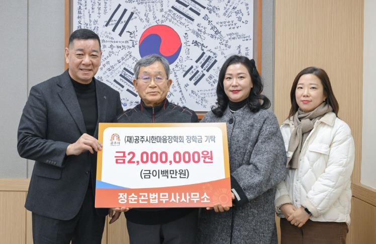 [뉴스스텝] 정순곤법무사사무소는 지난 6일 (재)공주시한마음장학회에 가정형편이 어려운 학생들을 위한 장학금 200만 원을 기탁했다.