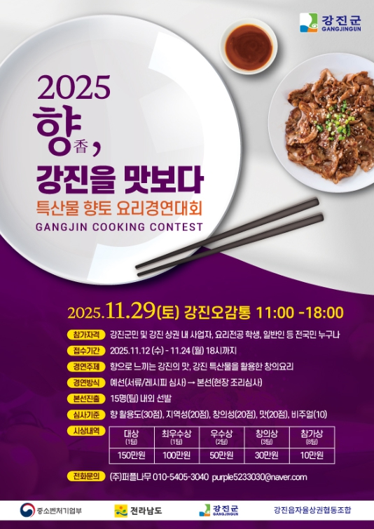 대회 참가 자격은 강진군민과 상권 내 사업자, 요리전공 학생, 일반인 등 전국민에게 열려 있으며, 예선(서류·레시피 심사)을 거쳐 본선 진출자 15명 내외를 선발하며, 시상 내역으로는 ▲대상(150만원) ▲최우수상(100만원) ▲우수상(각 50만원) ▲창의상(각 30만원) ▲참가상(각 10만원) 등으로 총 15팀이 수상한다.