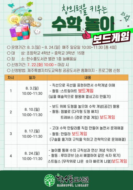 제주도교육청 한수풀도서관, 어려운 수학도 보드게임으로 즐겁게 배워요