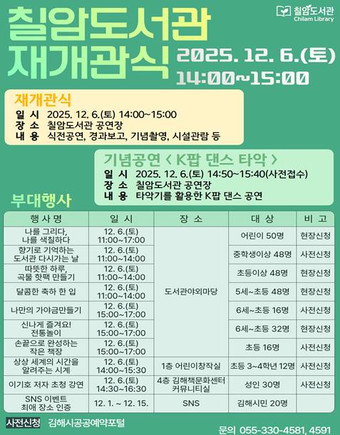 [뉴스스텝] 김해시 칠암도서관이 오는 6일 도서관 공연장에서 재개관식을 개최한다고 2일 밝혔다.