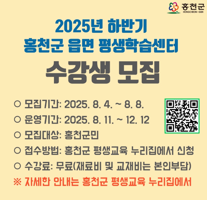 [뉴스스텝] 홍천군은 8월 7일부터 8월 8일까지 [2025년 하반기 홍천군 읍・면 평생학습센터] 프로그램 수강생 모집을 실시한다.