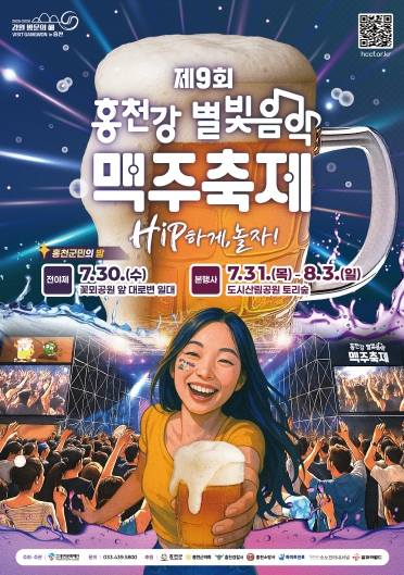 [뉴스스텝] 제9회 홍천강 별빛음악 맥주축제가 "Hip하게, 놀자!"라는 톡톡 튀는 슬로건 아래 7월 30일 꽃뫼공원 앞 대로변에서의 화려한 전야제를 시작으로 7월 31일부터 8월 3일까지 도시산림공원 토리숲에서 본격적으로 열린다.