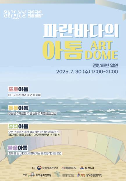 [뉴스스텝] (재)삼척관광문화재단은 오는 7월 30일 오후 5시부터 9시까지 근덕면 맹방해수욕장 일원에서 어촌마을 주민과 관광객을 대상으로 ‘문화가 있는 날, 구석구석 문화배달 - 파란 바다의 아톰(ART DOME)’ 프로그램을 운영한다.