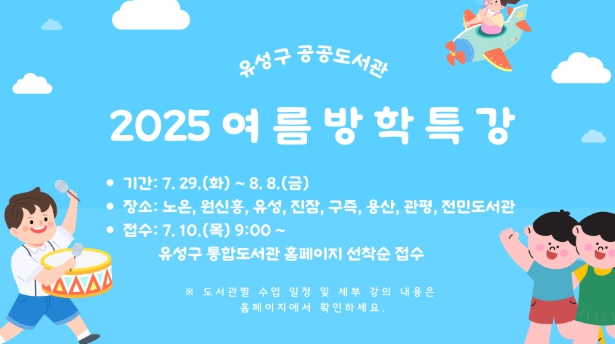 정용래 유성구청장은 “도서관에서 진행되는 방학 특강이 아이들에게 책·놀이·배움이 어우러진 유익한 시간을 보내길 바란다”라며 “도서관을 중심으로 아이들이 책과 함께 즐길 수 있는 배움의 기회를 마련하겠다”라고 말했다.
