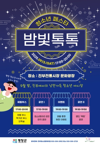 [뉴스스텝] 평창군은 오는 9월 13일 오후 5시부터 8시까지 진부면 전통시장 문화 광장에서 ‘밤빛 톡톡(Talk Talk) 청소년 페스타’를 개최한다.