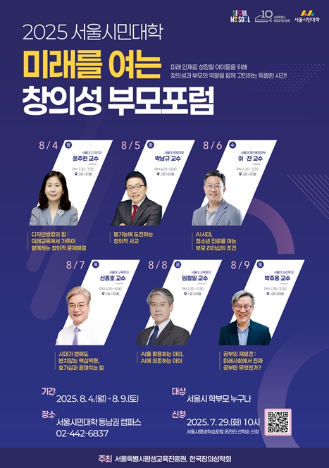 [뉴스스텝] 서울시평생교육진흥원은 오는 8월 4일부터 9일까지 6일간, 서울시민대학 동남권캠퍼스(서울 강동구)에서 ‘미래를 여는 창의성 부모포럼’을 개최한다. 청소년 자녀를 둔 학부모를 대상으로 서울대 교수진과 함께 AI시대에 필요한 창의성 교육과 부모 역할을 짚어보는 자리다.