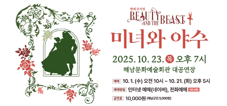 [뉴스스텝] 해남군은 오는 10월 23일 오후 7시 해남문화예술회관 대공연장에서 발레뮤지컬 ‘미녀와 야수’공연을 선보인다.