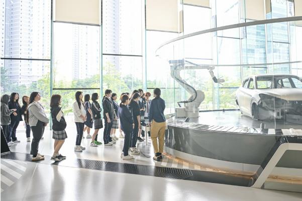 ▲ 세그루패션디자인고 학생들이 지난 10월 1일 ‘현대모터스튜디오’를 방문, 로봇 자동화 공정 과정에 대한 설명을 듣고 있다.