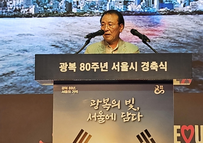 ▲ '광복 80주년 서울시 경축식'에서 경축사하는 이종환 부의장 |