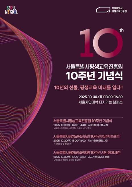 [뉴스스텝] 서울시평생교육진흥원이 설립 10주년을 맞아 오는 10월 30일 서울시민대학 다시가는 캠퍼스에서 '서울시평생교육진흥원 10주년 기념식'을 개최한다. 이번 행사는 지난 10년의 성과를 되짚고 미래 비전을 제시하는 자리를 넘어, 시민이 직접 참여하고 즐기는 다채로운 축제의 장으로 마련된다.