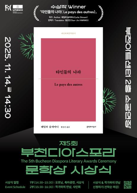 [뉴스스텝] 부천시는 11월 14일 부천아트센터에서 열리는 ‘2025년 제5회 부천디아스포라문학상’ 시상식을 앞두고, 수상작으로 레일라 슬리마니 작가의 ‘타인들의 나라(Le pays des autres)’를 선정했다고 22일 밝혔다.