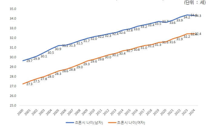 ▲ 서울시 초혼 평균 연령(2000~2024년) 출처: 통계청, '인구동향조사', 각 년도 |