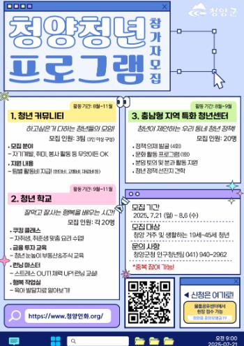 참여 신청은 청양군 홈페이지 또는 청양군 청년 전용 온라인 플랫폼 ‘청양연화'을 통해 가능하다.