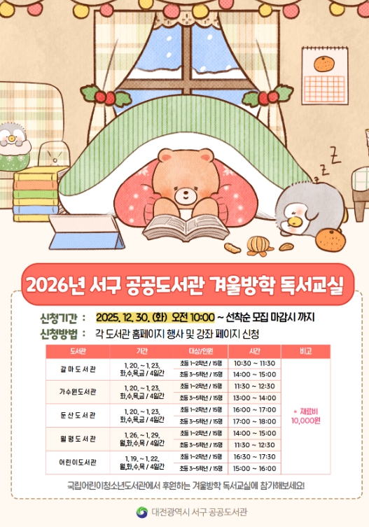 [뉴스스텝] 대전 서구는 겨울방학을 맞아 관내 초등학교 1~5학년 어린이를 대상으로 5개 공공도서관에서 ‘겨울방학 독서 교실’을 운영한다고 23일 전했다.