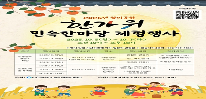 [뉴스스텝] 인천광역시 월미공원사업소는 오는 10월 5일부터 7일까지 3일간 월미공원 내 전통정원(양진당)에서 ‘한가위 민속한마당 체험행사’를개최한다고 밝혔다.