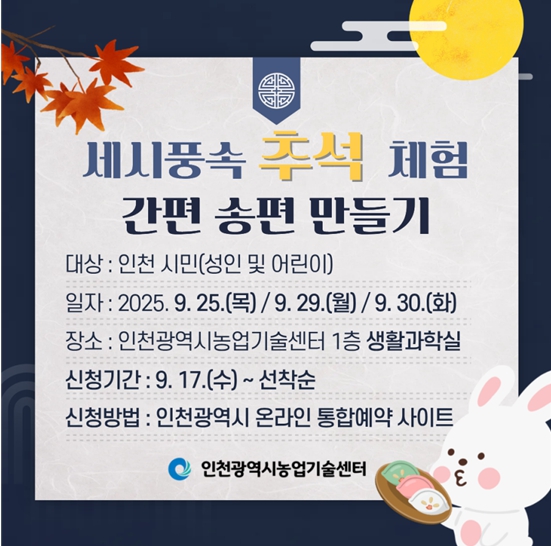 [뉴스스텝] 인천광역시 농업기술센터는 다가오는 명절 한가위를 맞아 시민들이 전통문화를 직접 체험하며 추석의 의미와 농업·농촌의 가치를 되새길 수 있도록 ‘추석 체험 프로그램’을 운영한다고 밝혔다.