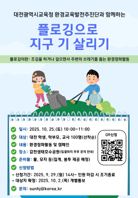 [뉴스스텝] 대전시교육청은 10월 25일 갑천생태호수공원에서 가정‧지역 연계 생태전환교육 실천 확산을 위한 2025년 '지구 기살리기 캠페인' 플로깅을 실시한다고 밝혔다.