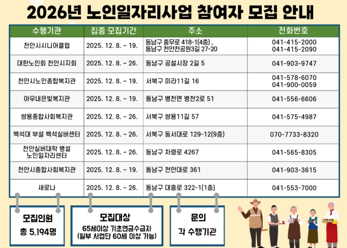 노인일자리사업은 천안시시니어클럽, 대한노인회 천안시지회, 천안시 노인종합복지관, 아우내은빛복지관, 쌍용종합사회복지관, 백석대 부설 백석실버센터, 천안실버대학 병설 노인일자리센터, 천안시종합사회복지관, 새로나 총 9개 기관에서 추진한다.