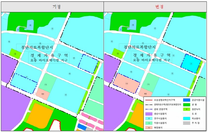 [뉴스스텝] 충북도는 11월 17일 오송첨단의료복합단지의 토지이용계획을 변경하는 개발실시계획이 승인됐다고 밝혔다. 이를 통해 오송읍 연제리 682-2, 682-3은 연구시설용지에서 복합용지로, 연제리 657은 연구시설용지에서 학교시설용지로 변경된다.