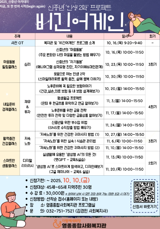 [뉴스스텝] 인천 중구 영종종합사회복지관은 오는 10월 16일부터 11월 24일까지 45세~65세 지역 주민을 대상으로 신중년 아카데미 ‘비긴어게인’을 운영한다고 밝혔다.