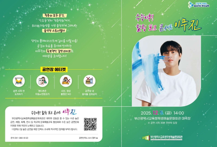 [뉴스스텝] 부산광역시교육청학생예술문화회관(관장 박은혜)은 오는 5일 오후 2시 학생예술문화회관 대극장에서 수능을 마친 고3 학생 700여 명을 대상으로 가수 이무진과 함께하는 ‘수능 이후! 힐링 토크 콘서트’를 개최한다.