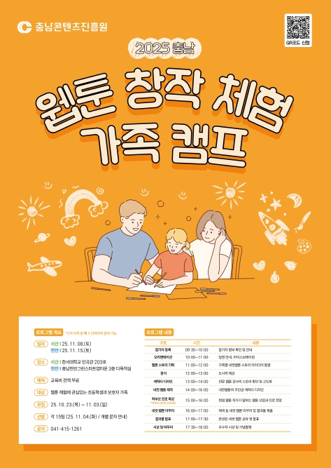 캠프는 서산 11월 8일, 천안 11월 15일에 각각 진행되며, 웹툰 창작에 관심 있는 충남도 거주 초등학생과 보호자가 한 팀을 이루어 참여할 수 있다.