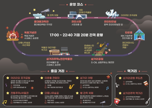 [뉴스스텝] 천안시가 ‘2025~2026 천안방문의 해’를 맞아 10월 31일부터 11월 1일까지 이틀간 야간 순환형 투어버스 ‘별빛 한바퀴 시즌2’를 운영한다.