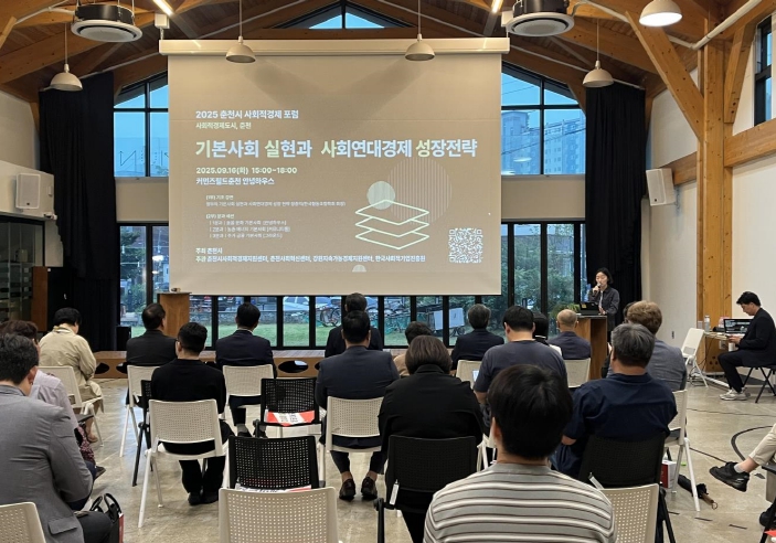 춘천시는 지난 16일 커먼즈필드춘천 안녕하우스에서 ‘춘천시 사회적경제 포럼’을 개최했다. 이날 열린 기조강연에서는 장종익 한신대 교수(전 국정기획위원회 기획위원)가 ‘정부의 기본사회 실현과 사회연대경제 성장전략’을 주제로 발표했다. 장 교수는 사회적경제가 기본사회 실현의 핵심 축임을 강조하며 지역 단위의 협력 모델 구축 필요성을 제시했다.