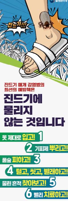 박봉숙 보건행정과장은 “가을철 농사일·야외활동 시 진드기 예방수칙을 준수하고 야외 활동 후 발열, 근육통, 설사 등의 증상이 있으면 바로 의료기관을 방문해 진료받을 것”을 당부했다.