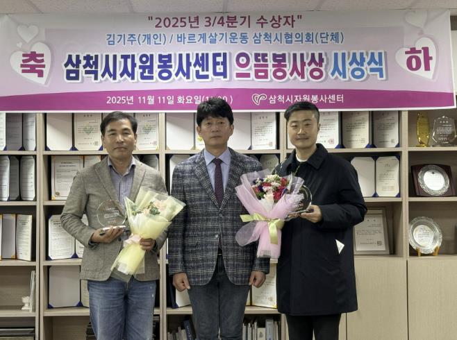 [뉴스스텝] 삼척시자원봉사센터는 11월 11일 자원봉사센터 회의실에서 ‘2025년 3분기 으뜸봉사상 시상식’을 열고, 지역사회 나눔과 봉사활동에 앞장선 우수 봉사자와 단체를 선정했다.