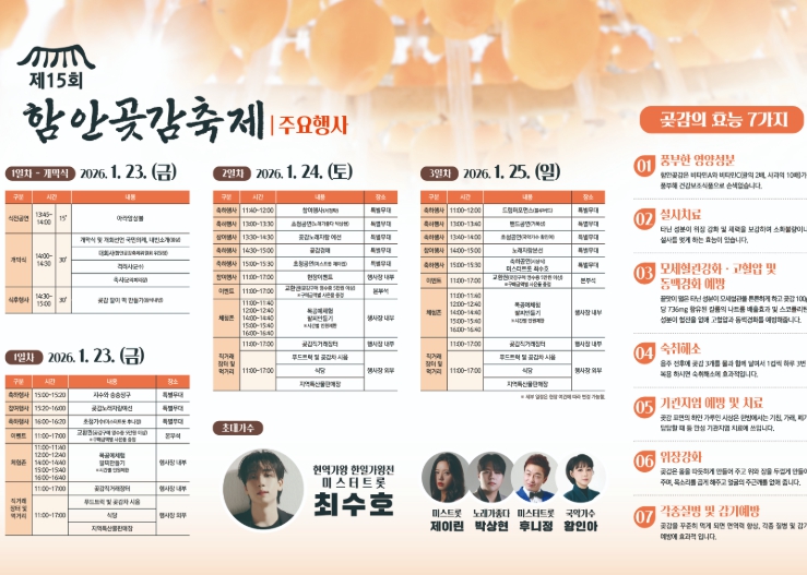 축제 관계자는 “올해 곶감은 다른 해에 비해 특히 품질이 뛰어나다”며 “ 축제장을 찾아 달콤한 겨울 간식 함안의 명품 곶감을 같이 즐겨주시길 바란다”고 전했다.