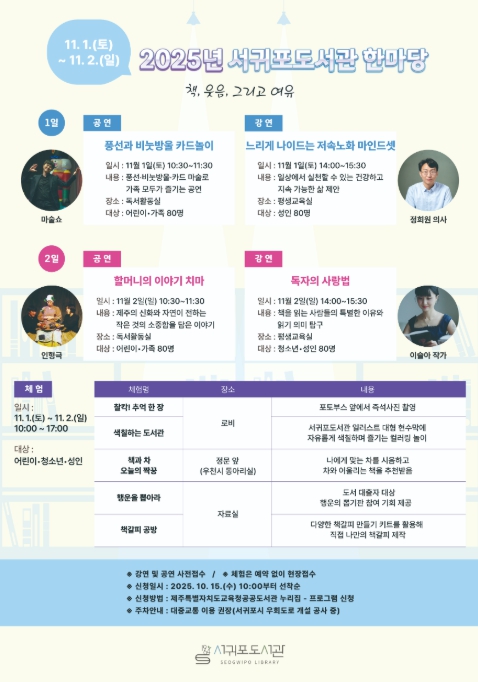 [뉴스스텝] 제주도교육청 서귀포도서관은 11월 1일과 2일 양일간 지역 주민이 함께 즐기는 독서문화 축제 ‘2025년 서귀포도서관 한마당’을 개최한다.