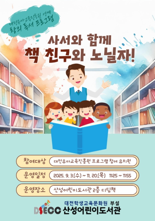 [뉴스스텝] 대전시교육청 대전학생교육문화원 부설 산성어린이도서관은 유아 독서교육 활성화를 위한 유관기관 연계 협력 사업 '창의 독서활동 프로그램'을 오는 9월부터 세 달간 총 20회에 걸쳐 운영한다고 밝혔다.
