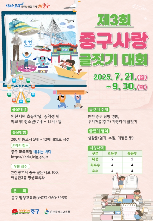 [뉴스스텝] 인천시 중구는 지역 청소년들을 대상으로 ‘제3회 중구 사랑 글짓기 대회’를 개최한다.