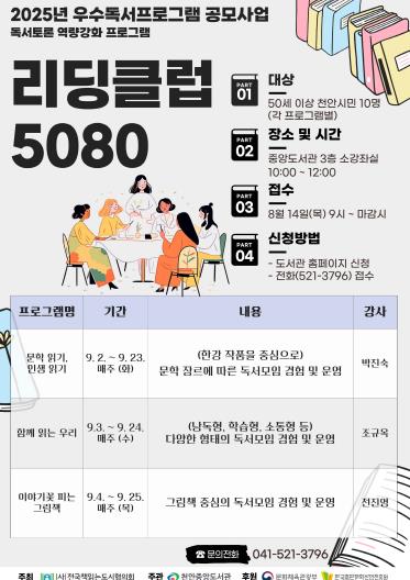 [뉴스스텝] 천안중앙도서관은 오는 9~ 10월 ‘리딩클럽 5080’을 운영한다고 14일 밝혔다.
