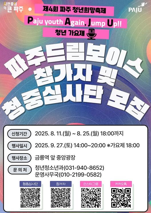 [뉴스스텝] 파주시는 오는 9월 27일 금릉역 앞 중앙광장에서 청년의 날을 기념해 개최되는 ‘제4회 파주 청년희망축제’의 대표 프로그램 중 하나인 청년가요제 ‘파주드림(Dream) 보이스’에 함께할 참가자와 청중심사단을 동시에 모집한다.