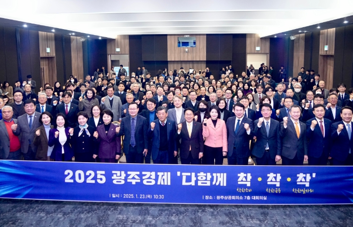 ▲ 강기정 광주광역시장이 지난 1월 23일 광주상공회의소 대회의실에서 열린 ‘2025 광주경제 다함께 착착착(착한소비·착한금융·착한일자리) 광주’에 참석해 경제단체, 산업계 등 76개 기관‧단체 관계자들과 함께 소비는 늘리고, 부담은 줄이고, 투자는 키우는 경제대책에 나서기로 결의를 다진 뒤 기념촬영을 하고 있다./광주광역시 제공 |