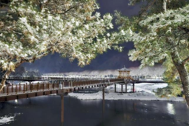 조명이 눈 위에서 퍼져 나가며 다리의 윤곽을 더욱 선명하게 밝혔고 고요한 물 위로 번진 빛이 겨울밤의 분위기를 깊게 만들었다.