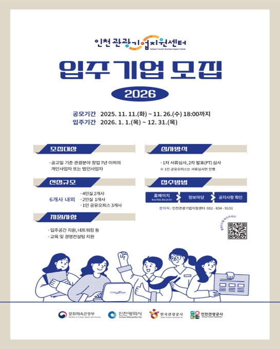 [뉴스스텝] 인천광역시와 인천관광공사는 관광산업의 혁신과 성장을 견인할 2026년 인천관광기업지원센터 신규 입주기업을 11일부터 26일까지 공개 모집한다고 밝혔다.