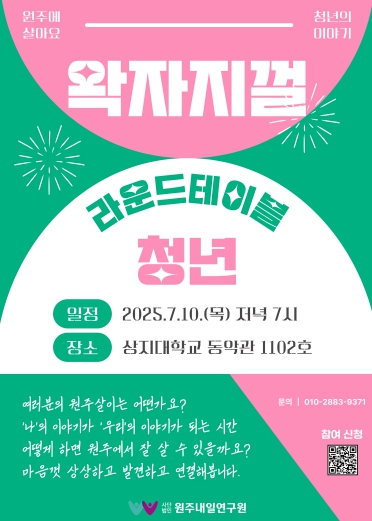 참가 신청은 행사 포스터의 QR코드를 통해 사전 접수할 수 있으며, 원주에 거주하는 청년이라면 누구든 참여가능하다.