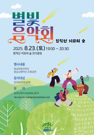 [뉴스스텝] 계룡시는 오는 23일 오후 7시부터 8시 30분까지 향적산 치유의 숲 잔디광장에서 ‘향적산 치유의 숲 별빛음악회’를 개최한다고 밝혔다.