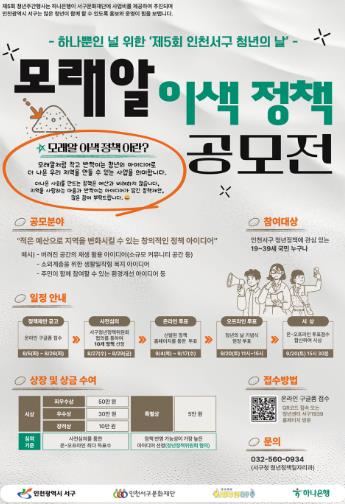 [뉴스스텝] 인천 서구는 하나은행의 후원으로 인천서구문화재단과 공동 주관하여 추진되는 ‘하나뿐인 널 위한 제5회 인천서구 청년의 날’ 기념 행사의 일환으로, 26일까지 작지만 반짝이는 ‘모래알 이색 정책 공모전’을 개최한다고 13일 밝혔다.