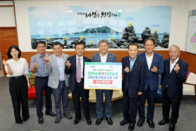 [뉴스스텝] 제주시 김녕농협과 충남 논산시 연무농협은 8월 12일 시장 집무실에서 고향사랑기부금 상호 기탁식을 갖고, 지역 간 상생협력을 다짐했다.