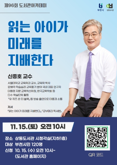 [뉴스스텝] 부천시는 11월 15일 오전 10시 부천시립상동도서관 시청각실에서 인공지능(AI)·디지털 시대 학습 경쟁력의 핵심인 문해력을 주제로 ‘제96회 도서관 아카데미’를 연다. 이번 강연은 ‘읽는 아이가 미래를 지배한다’의 저자이자 서울대학교 교육학과 교수인 신종호 교수를 초청해 진행한다.