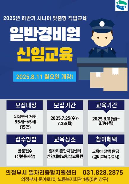 [뉴스스텝] 의정부시는 관내 시니어 세대의 재취업을 지원하고 안정적인 일자리를 연계하기 위해 ‘일반경비원 신임교육’ 참여자를 모집한다.