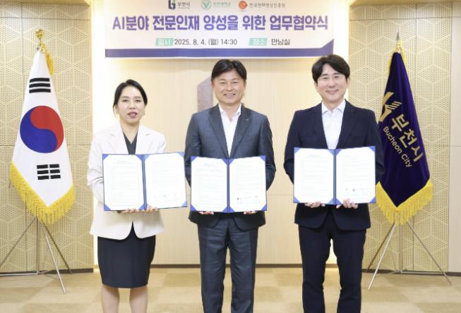 [뉴스스텝] 부천시는 지난 4일 부천시청 만남실에서 유한대학교, 한국만화영상진흥원과 함께 ‘인공지능(AI) 분야 첨단산업 인재 양성을 위한 만화‧영상 부트캠프 운영’ 업무협약을 체결했다고 5일 밝혔다.
