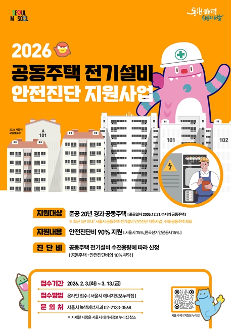 [뉴스스텝] 서울시는 노후 공동주택의 정전사고를 사전에 차단하고, 시민 생활안전을 강화하기 위해 ‘2026년 공동주택 전기설비 안전진단 지원사업’을 추진한다. 한국전기안전공사와 협력해 공동주택 전기설비의 적정 운전·관리 상태를 종합 진단하고, 진단비의 90%를 지원한다.