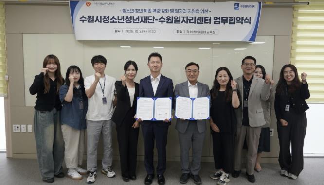 [뉴스스텝] 수원시청소년청년재단과 수원일자리센터는 10월 2일, 청소년청년의 취업 역량 강화와 일자리 지원을 위한 업무협약(MOU)을 체결했다.