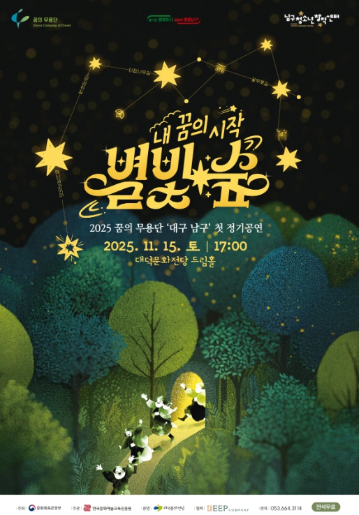 [뉴스스텝] 대구 남구청소년창작센터는 오는 11월 15일 17시 대덕문화전당 드림홀에서 꿈의 무용단 '대구 남구'의 첫 정기공연 ‘내 꿈의 시작, 별빛 숲’을 개최한다고 밝혔다.